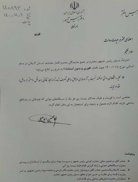 در ادامه این نامه تاکید شده که با فوریت و ظرف حداکثر ۲۰ روز هر یک از دستگاههای دولتی که تصرفاتی در مناطق ساحلی دارند، اقدام لازم و معمول و نتیجه برای استحضار را به دفتر رئیس جمهور اعلام کنند.